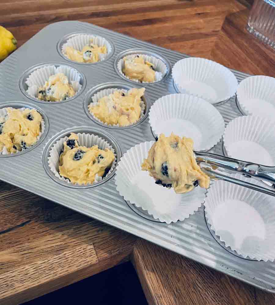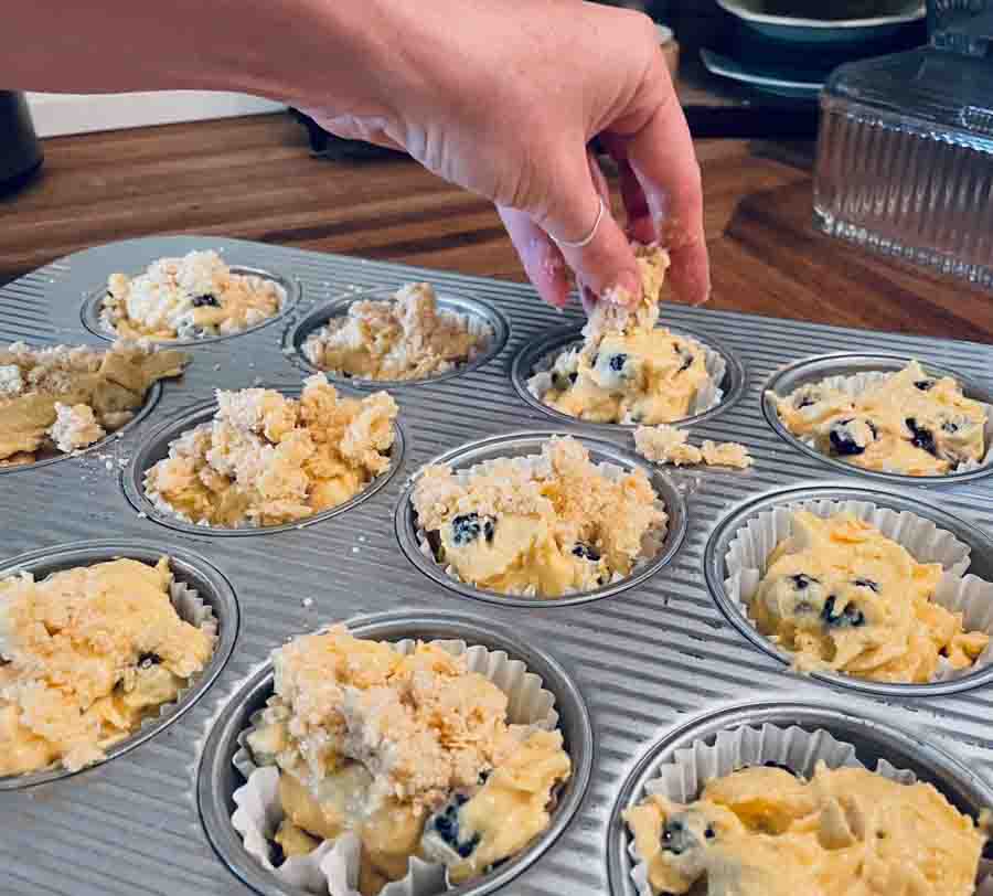 • Drop equal sized portions of batter into a lined muffin pan. The batter will be thick. This is typically enough to make one dozen standard sized muffins. Do your best to equally distribute your streusel topping on the muffins. Save yourself the frustration and just use your fingers.