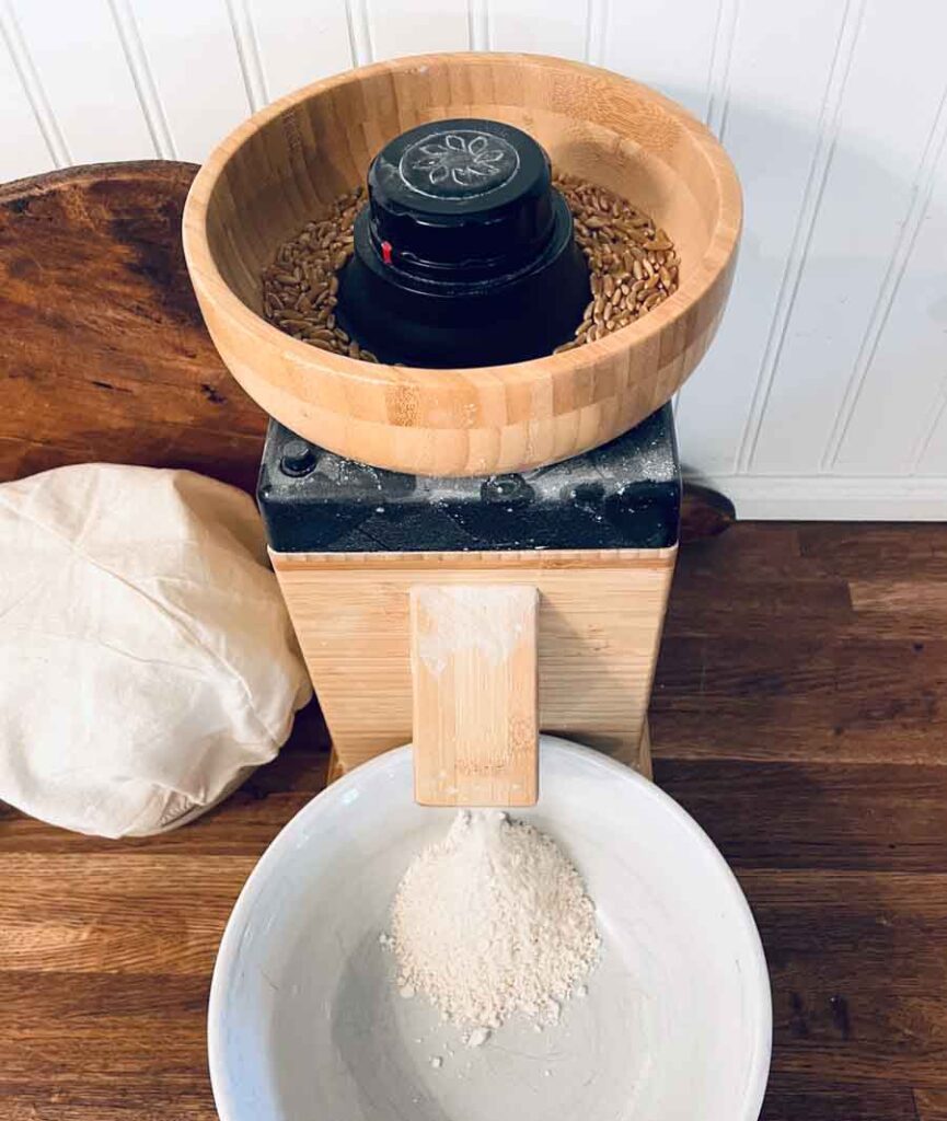 Now is a good time to get your flour milled and the dry ingredients added to it. Be sure to give it a quick stir so everything is evenly distributed. If you’re using conventional all-purpose flour, just measure out 1 ½ cup or 160 grams and do the same.