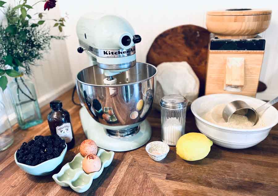 When the butter, sugar, eggs, vanilla, lemon juice and zest, sourdough and sour cream have become a fragrant and airy batter, add in your dry ingredient mixture in a few increments, allowing it to be incorporated as you go. As soon as it has come together, stop. Gently fold in your berries.