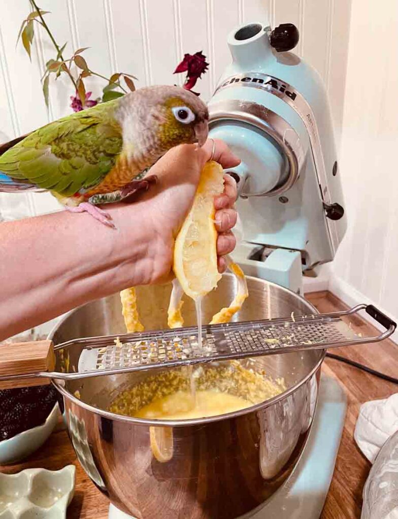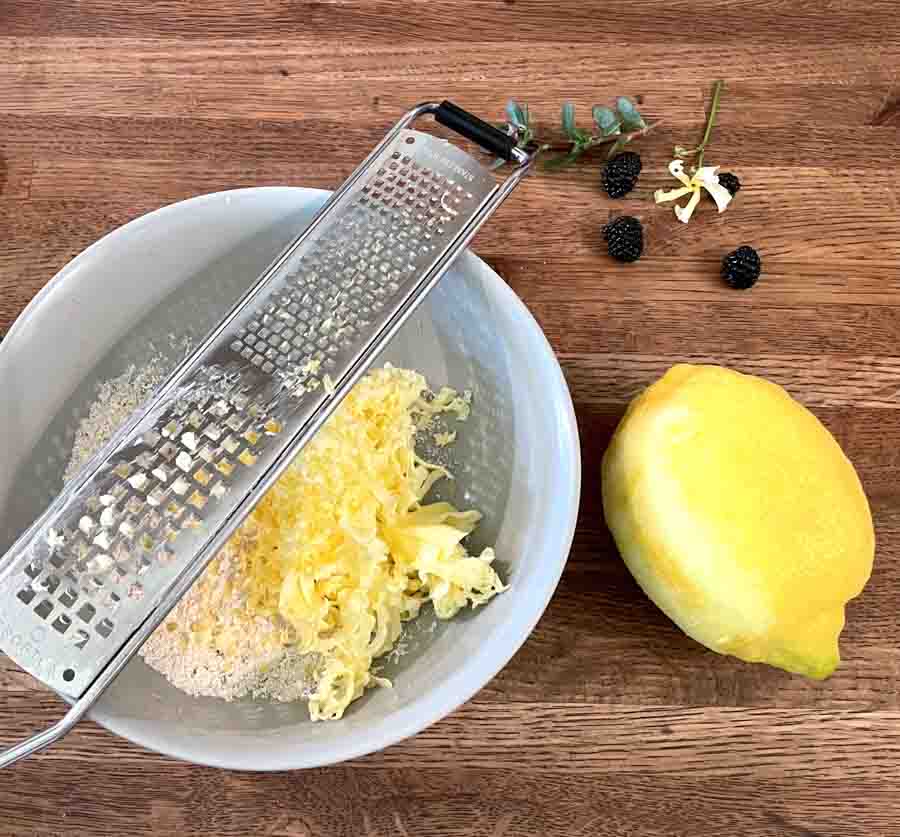Just mix up the streusel and set it in the fridge for now. (TIP: I use my zester to grate the cold butter, and then I use it later to strain out the lemon seeds, super handy!)